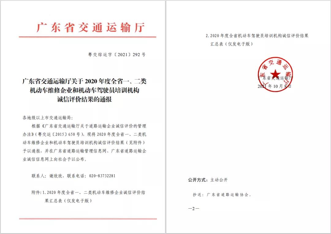 广东省交通运输厅关于2020年度全省一、二类机动车维修企业和机动车驾驶员培训机构诚信评价结果的通报