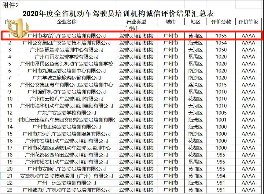 热烈祝贺【广州粤安驾校】荣获2020年度“AAAA级驾校”评比第一名!
