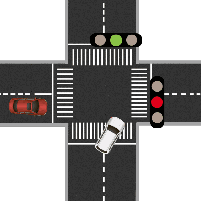 如图所示,当通过十字路口时,白色小车越过了停止线,绿灯变红。当另一方向的信号灯由红变绿,红色小车进入路口就算直行,也要让白色小车先行通过。一旦发生交通事故,后进入交叉路口的红色小车负全责。